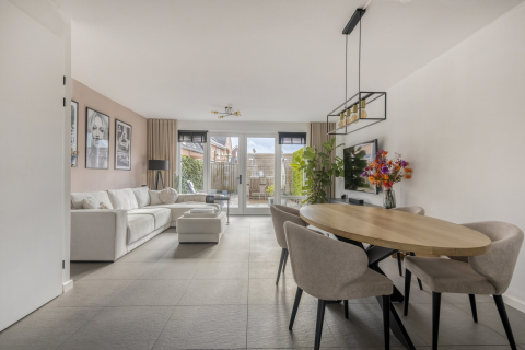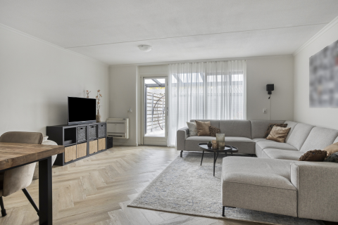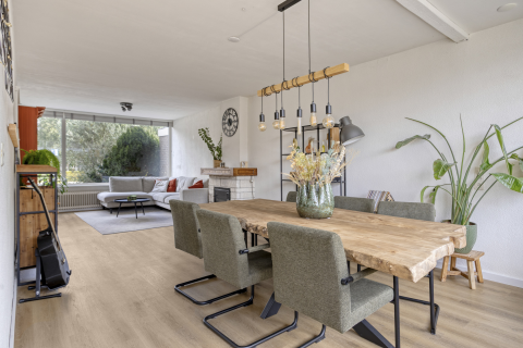 De woonkamer heeft een oppervlakte van 32,4 m² en is afgewerkt met een tegelvloer in houtmotief en hoge witte plinten. De wanden zijn uitgevoerd in spachtelpoets en het plafond is strak gestuct. Aan de voorzijde is ruimte genoeg voor een royale hoekbank met extra zitplekken bij de tv. Aan de achterzijde plaats je met gemak een grote eettafel met zes stoelen — de ideale plek om samen te eten of een spel te doen. Waar vroeger de keuken stond, is nu extra leefruimte ontstaan; de keuken is verplaatst naar de aanbouw.