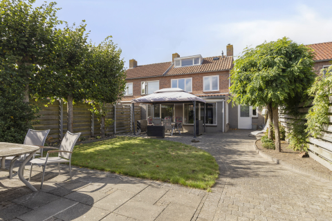 Vanuit de keuken stap je de onderhoudsvriendelijke achtertuin in. De tuin is aangelegd met sierbestrating, zodat je weinig onderhoud hebt en het geheel makkelijk kunt aankleden met planten of potten. Onder de overkapping van 4 meter lang en 2,44 meter breed zit je ook op warme, regenachtige dagen heerlijk buiten. Achter de overkapping staat de stenen berging van 3,19 meter breed en 2,37 meter diep, met genoeg ruimte voor fietsen en tuinspullen. Via de brandgang kom je eenvoudig met de fiets achterom.